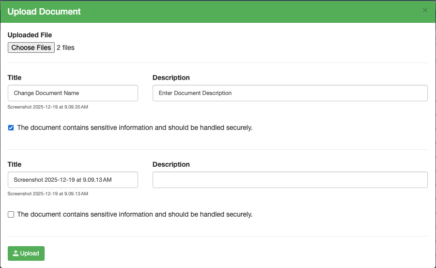 If a document should be encrypted (such as a passport) select the checkbox The document contains sensitive information and should be handled securely, then click Upload.