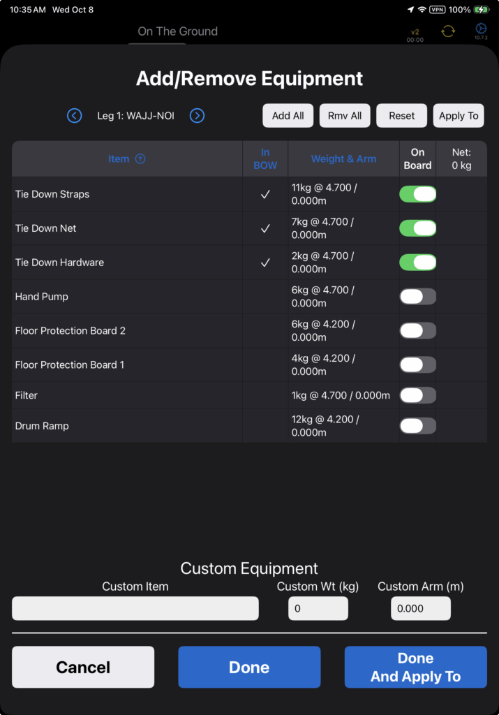Name the item, add it to a category of similar items, and enter the weight and arm(s). Toggle the Included in Basic Operating Weight to Yes if the equipment is included in the Basic Operating Weight, and to No if it is not included in the BOW.