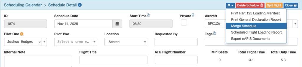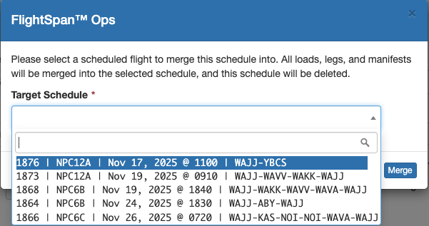 Notes, loads and manifests from the original flight will also be added to the merged flight. The original flight will be deleted.