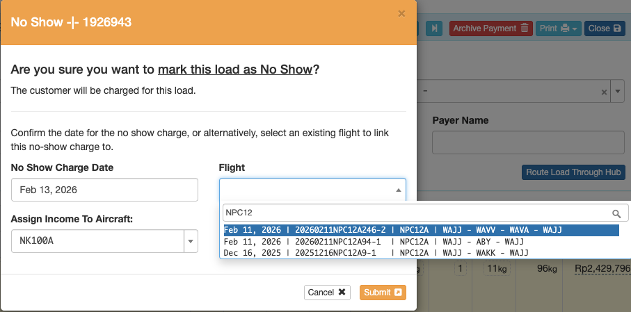 If the load is not already part of a completed Flight Record, search for and select the Flight Record the No Show load was on, and Submit.