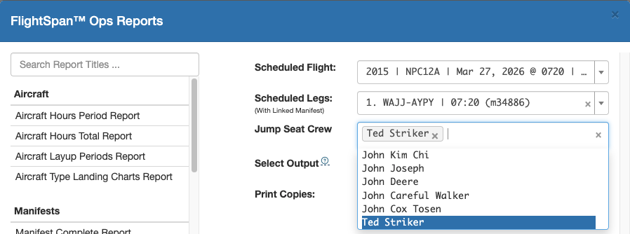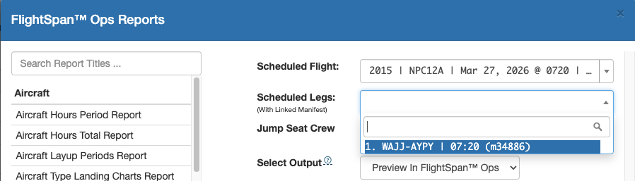 If you print from the Report link, select the scheduled flight. In either case, select the appropriate leg and manifest.