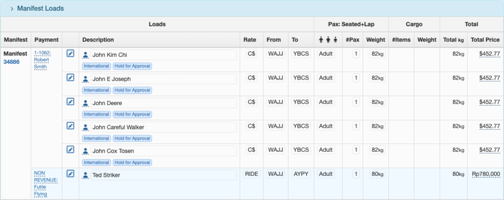 All loading must be added to one or more manifests as described in the Creating a FlightSpan Manifest documentation, with passengers itemized as described in the Customer Information documentation.