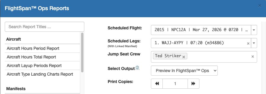 Note: This prints the FAA approved Part 125 manifest form. Use the normal FlightSpan manifest feature to print loading and passenger details.
