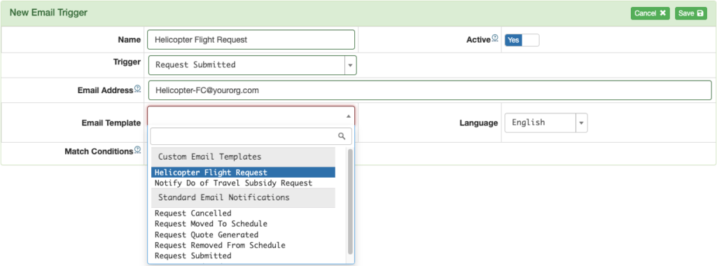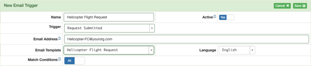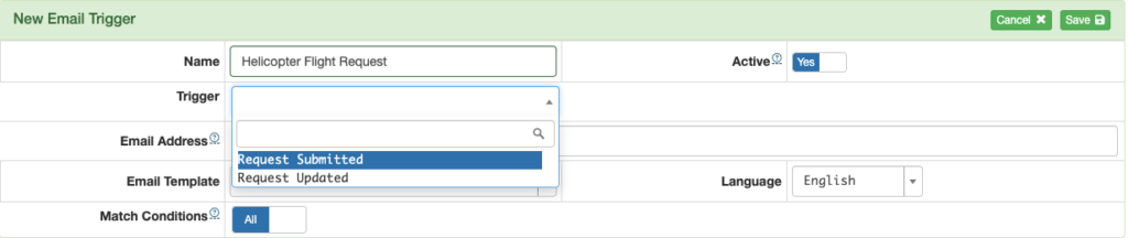 Next select whether you want the email sent when all conditions you set are met, or if any of the conditions are met, then save.