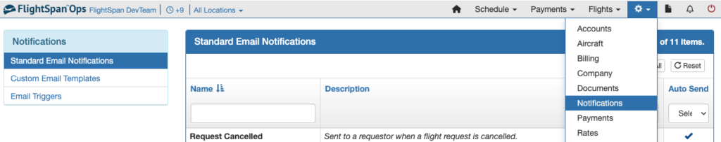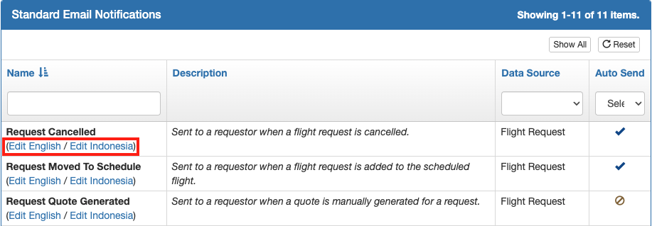 Click on the language(s) to edit each of the automatic notifications in the respective languages as desired. Note that the email will be sent in the preferred language your customer has set in their flight request profile.
