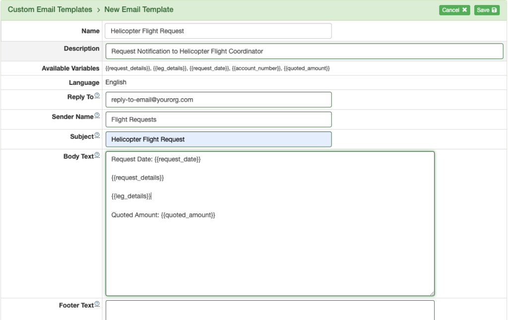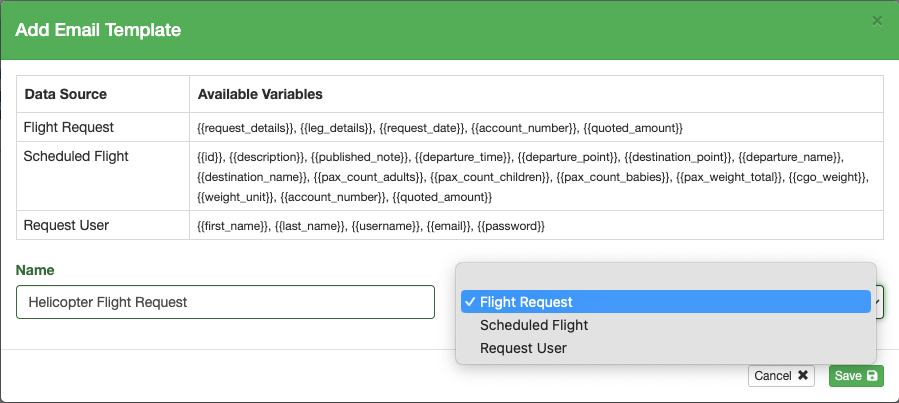 Text in {{double brackets}} collect data from the data source and fill them into the email. Copy and paste from the list of available variables as needed, then save.