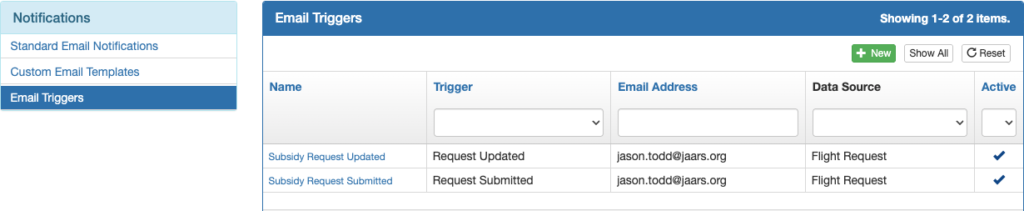 Next select Email Triggers from the Notifications menu and click the green New button.