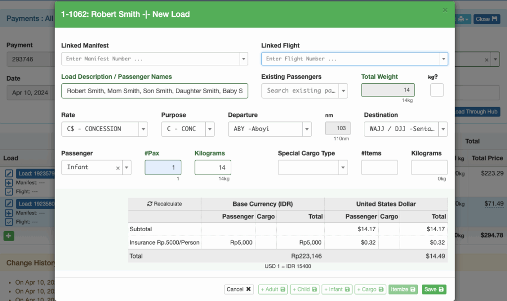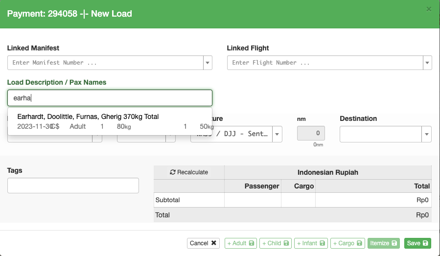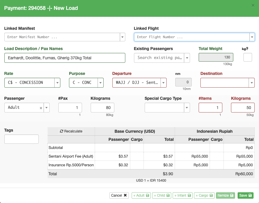 Loads without account and rate information will open the Payment Detail, and will automatically link to the flight once the cash receipt is printed.
