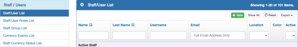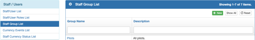 Then from the Staff / Users menu on the left, select Staff Group List, and click the green +New button.