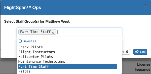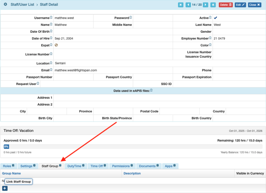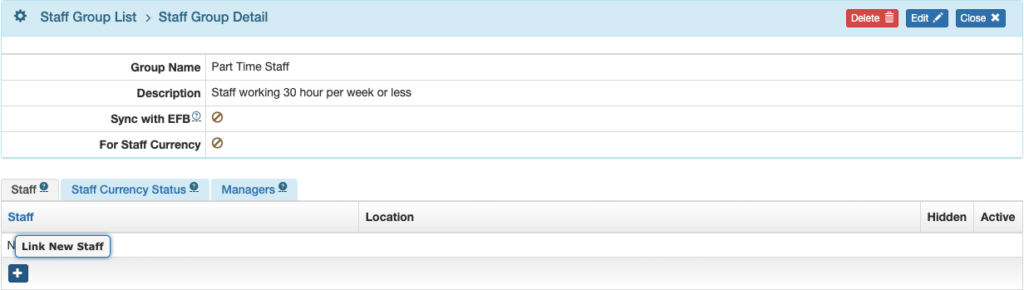 Staff may also be added to Staff Groups for the purposes of time off and currency management.