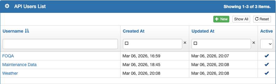 In FlightSpan, API Users are used to represent the pre-defined datasets that can be exported from or imported to FlightSpan. Contact FlightSpan support for help designing the datasets that you need.