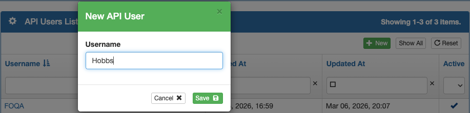 Create the new Username that was assigned to this dataset by FlightSpan Support, and save. (Spaces are allowed in the username.)