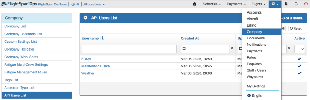 After the custom dataset has been created for you by the FlightSpan Support Team, from the Settings menu, select Company, then API Users List from the Company menu on the left.