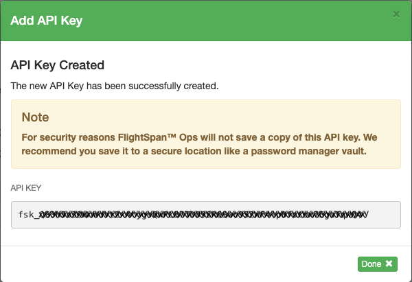 FlightSpan will generate an API Key. Be sure to copy the key and save it in a secure location such as a password vault. FlightSpan will not keep a copy of the key.