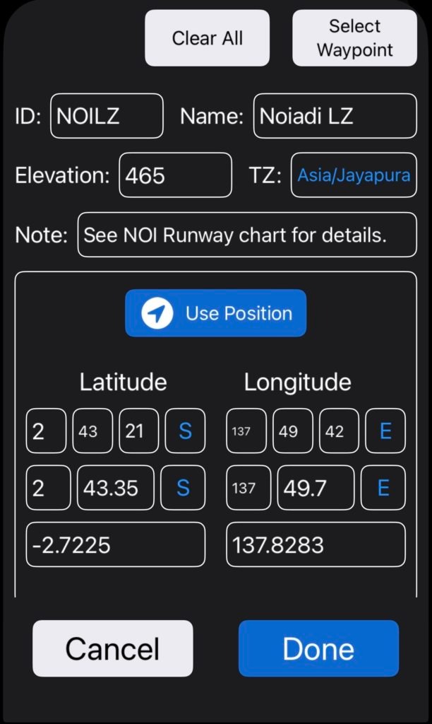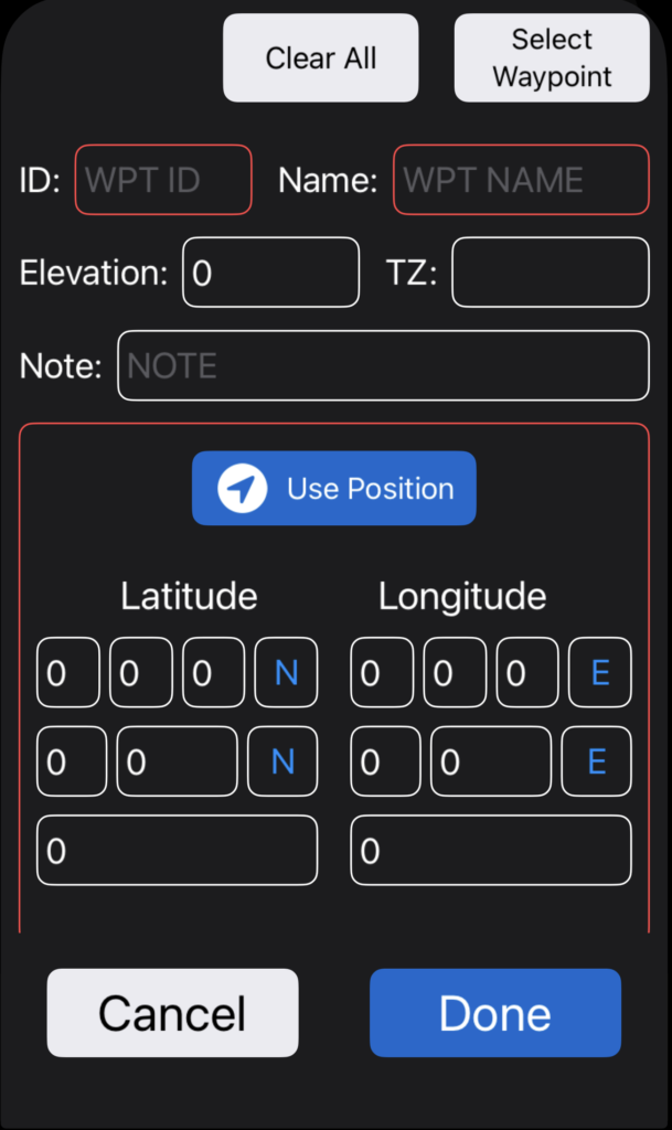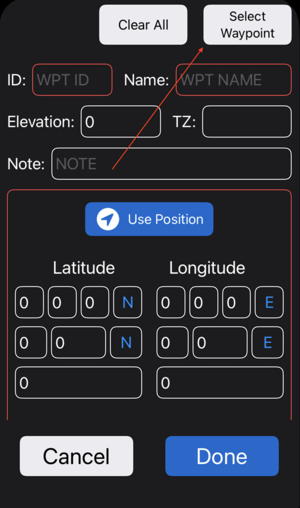 Enter the waypoint ID, waypoint name, elevation, and a note if desired.