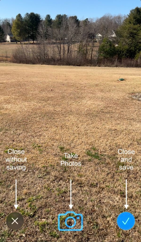 Tap the camera icon to take photos; tap the checkmark to save all photos to the app; tap the X to cancel and close the camera without saving the photos.