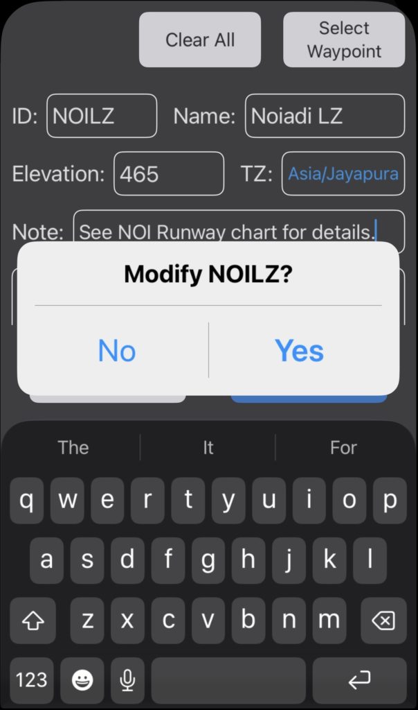 Enter the waypoint ID, waypoint name, elevation, and a note if desired.