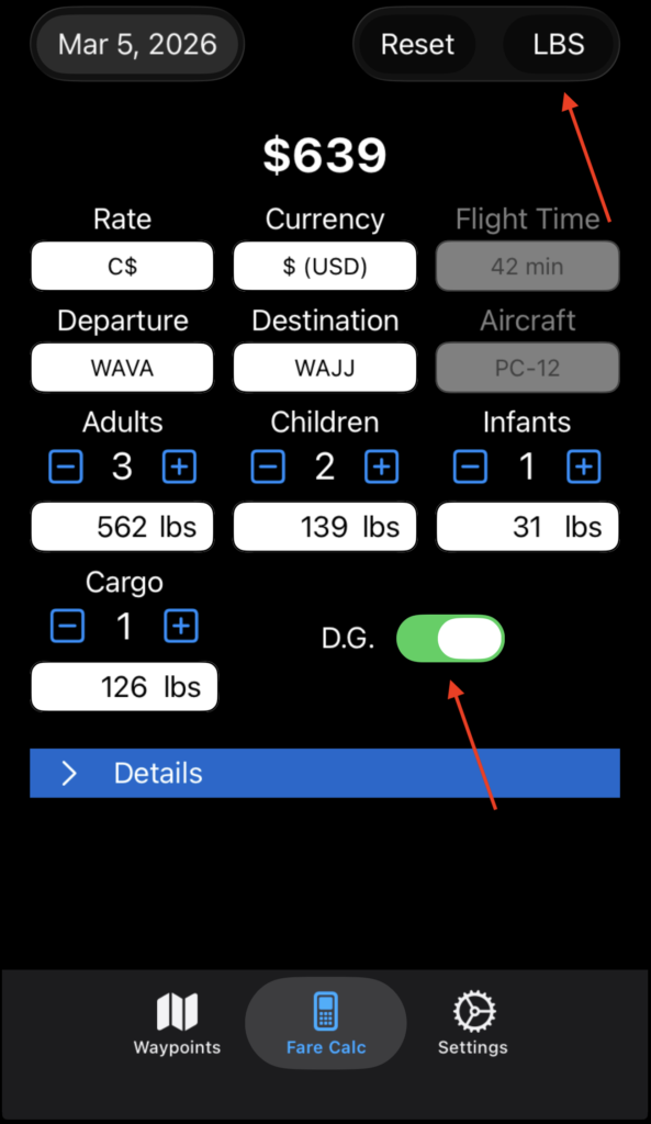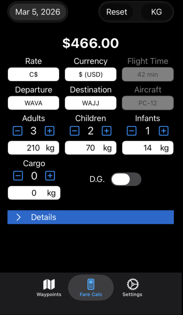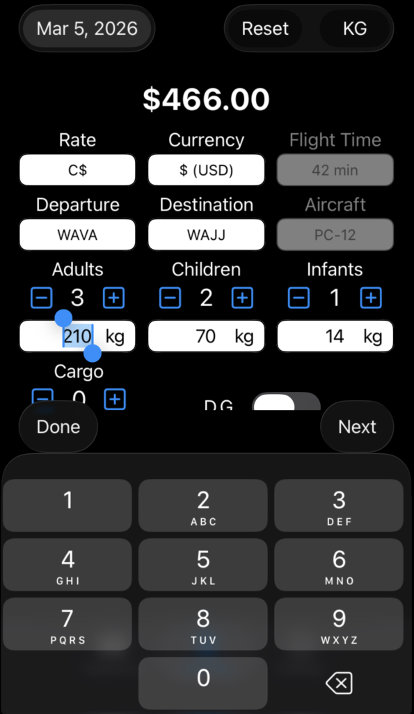 For calculated rates, time cannot be adjusted since it isn’t used in the calculation. Passenger and/or cargo loading must be entered.