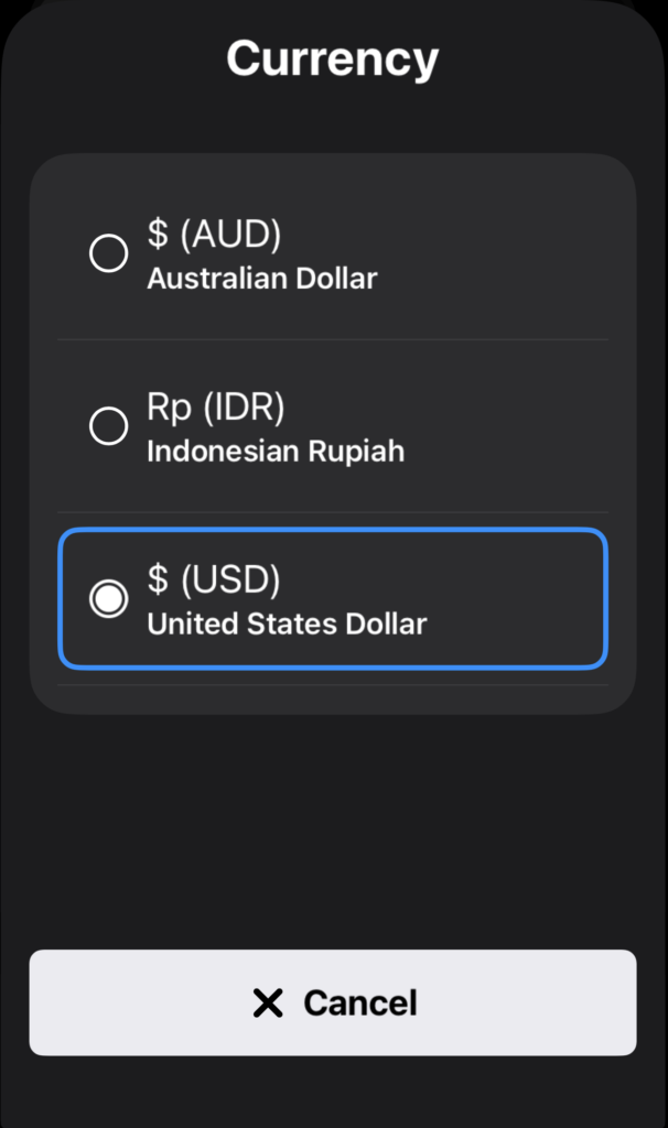 Tap the Currency field to change the cash currency if necessary.