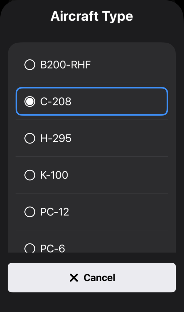 Tap the aircraft to change aircraft types as necessary.