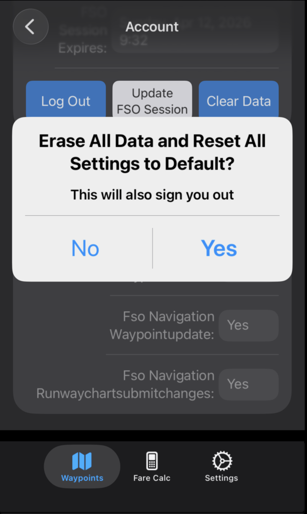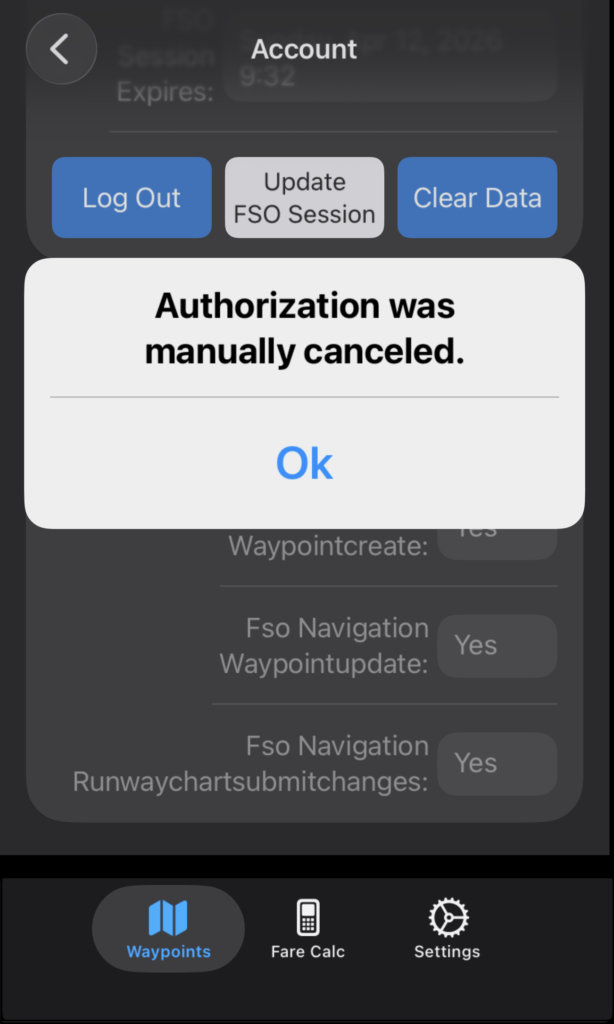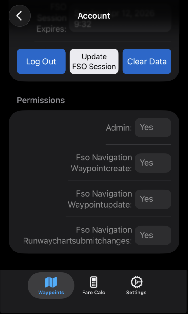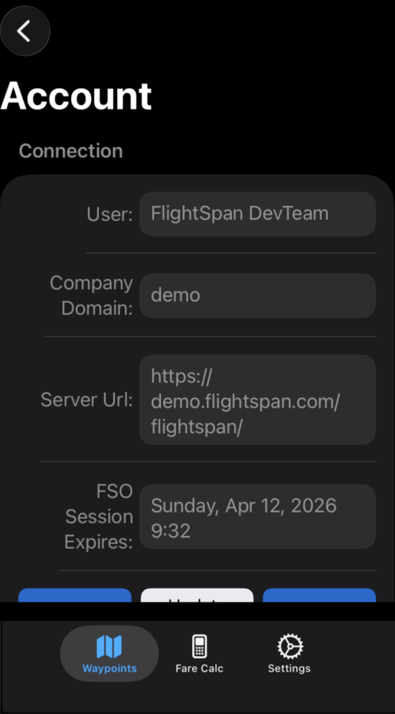 Tap Log Out to log out; tap Update FSO Session to enter login credentials again and reset the session expiration date and time.