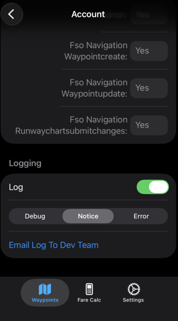 Logging is at the bottom of the page, and should be left on. With the logging on, if you encounter any errors or bugs, you can email the log to the FlightSpan™ development team. The type of logging should normally be left at ‘Notice’. For troubleshooting purposes, the FlightSpan™ development team may occasionally request you to change this to ‘Debug’ (which collects more detailed logs).